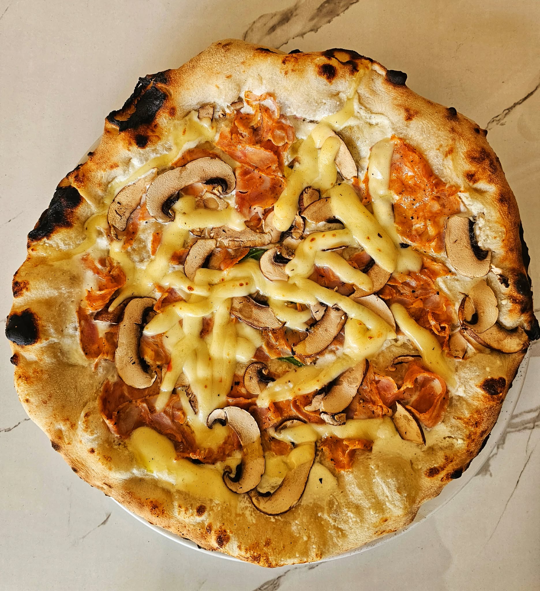 Base Tomate ou Crème de ricotta, Charcuterie de poulet fermier, Champignons, Mozzarella fleur de lait, Origan