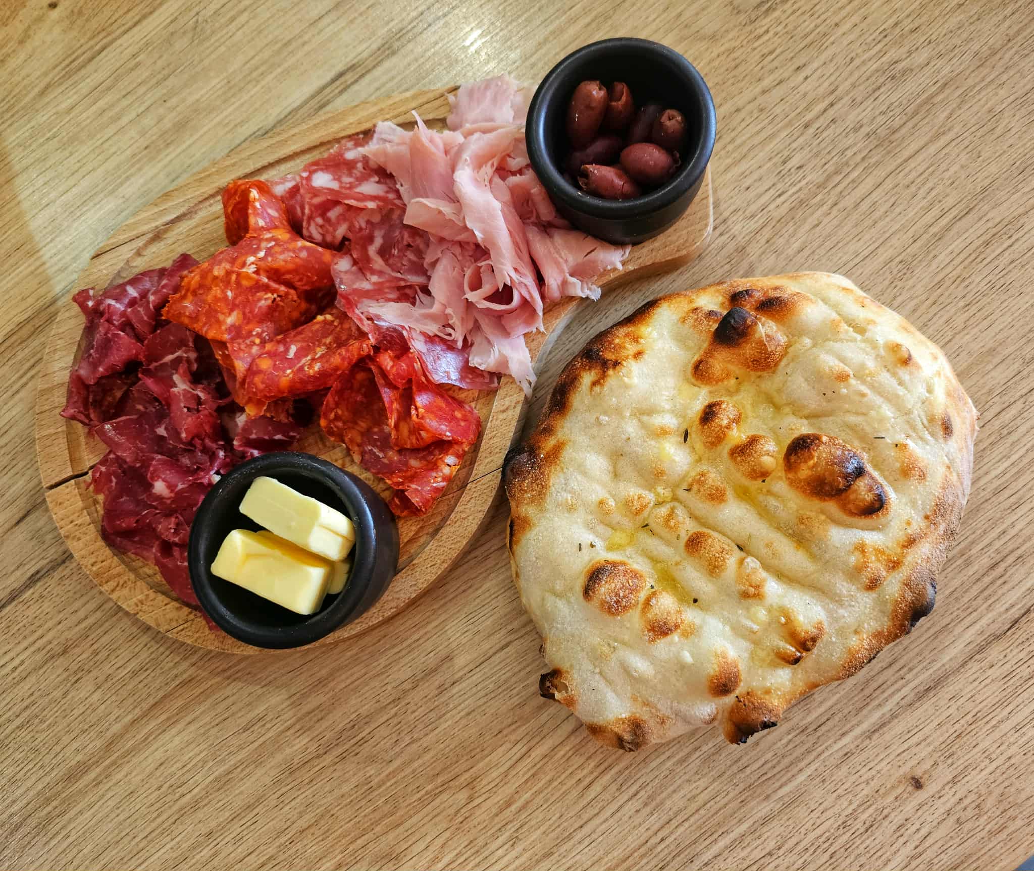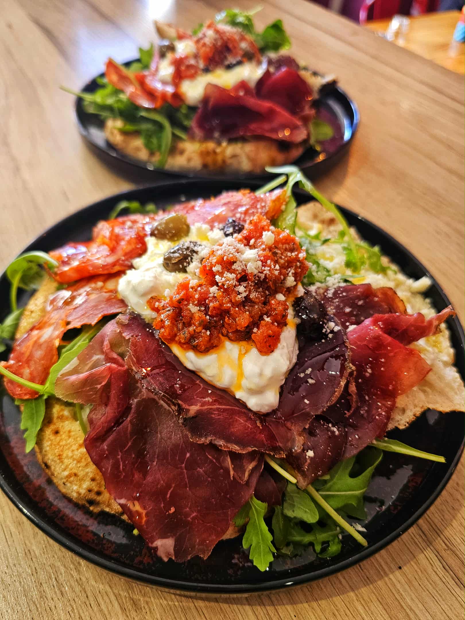 Crème de Ricotta, Roquette, Olives dénoyautées, Tomates cerises confites, Spinata de porc, Bresaola Black Angus, Saucisson de porc, Stracciatella, Huile d’olive, Grana padano