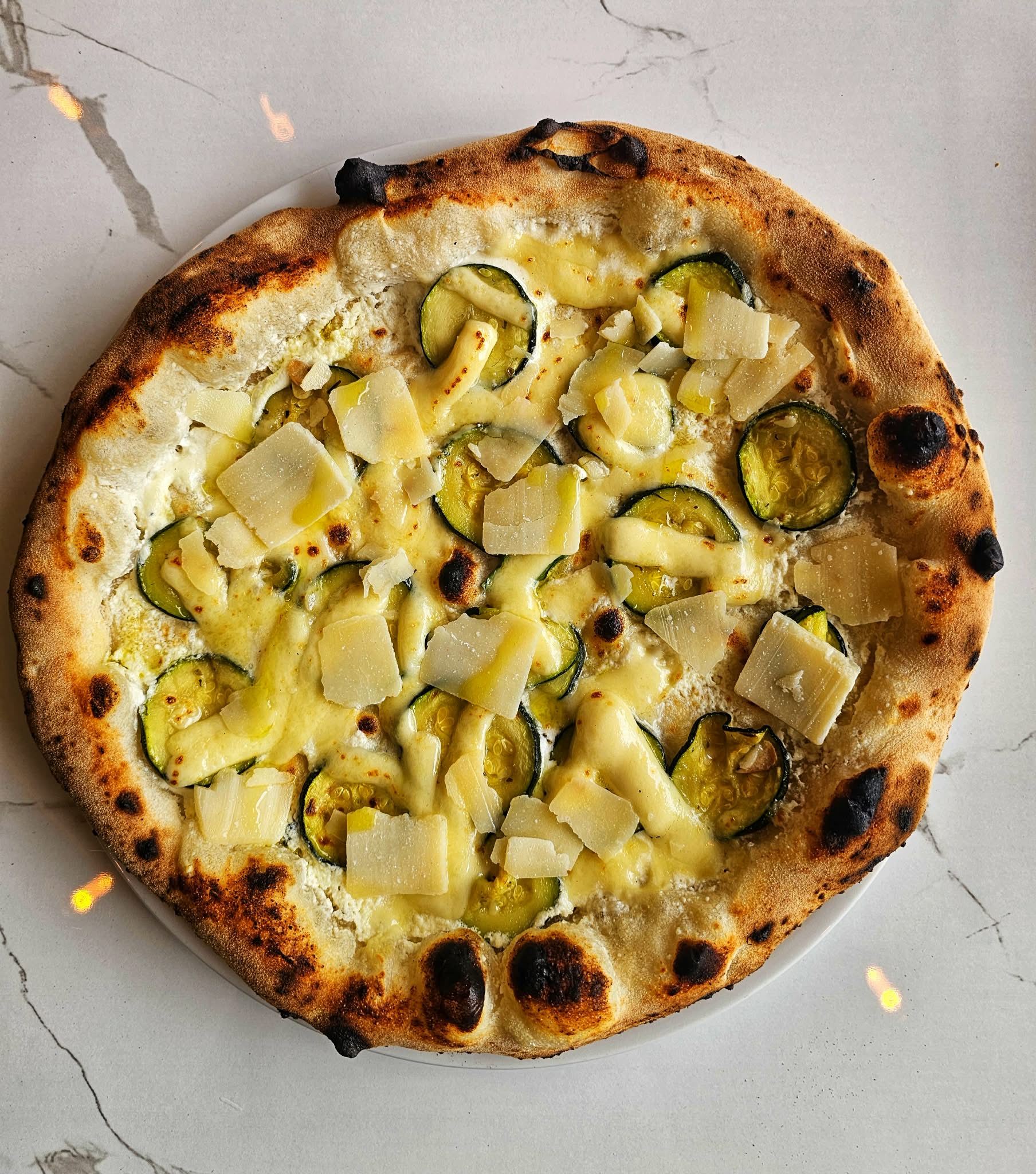 Crème de ricotta, Courgettes sautées à l’ail, Basilic, Mozzarella fleur de lait, Copeaux de Parmesan AOP