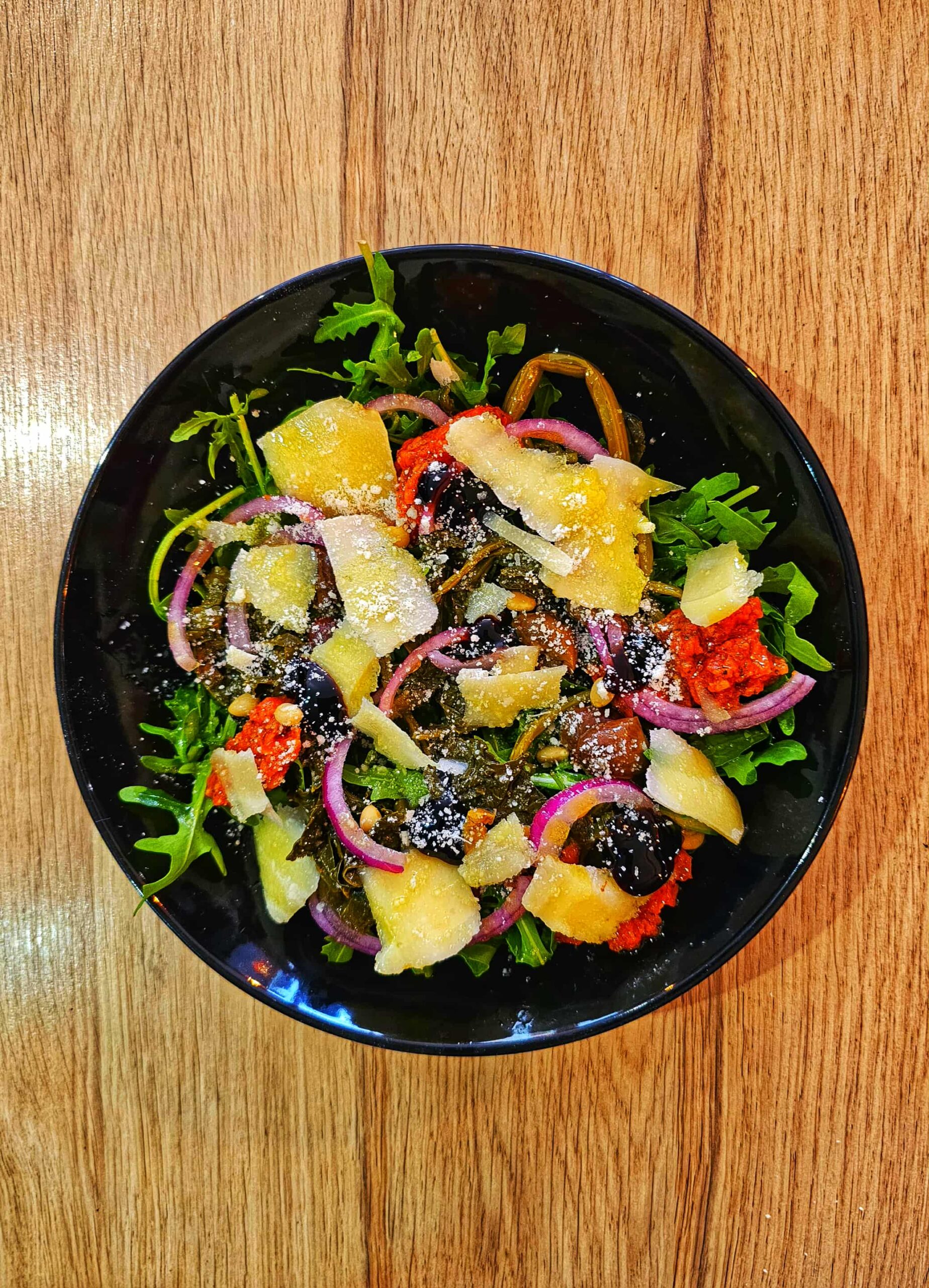 Roquette, Friarelli, Tartare de tomates, Olives Taggiasche, Oignon rouge, Copeaux de Grana Padano, Pignons grillés, Huile d’olive, Crème de balsamique