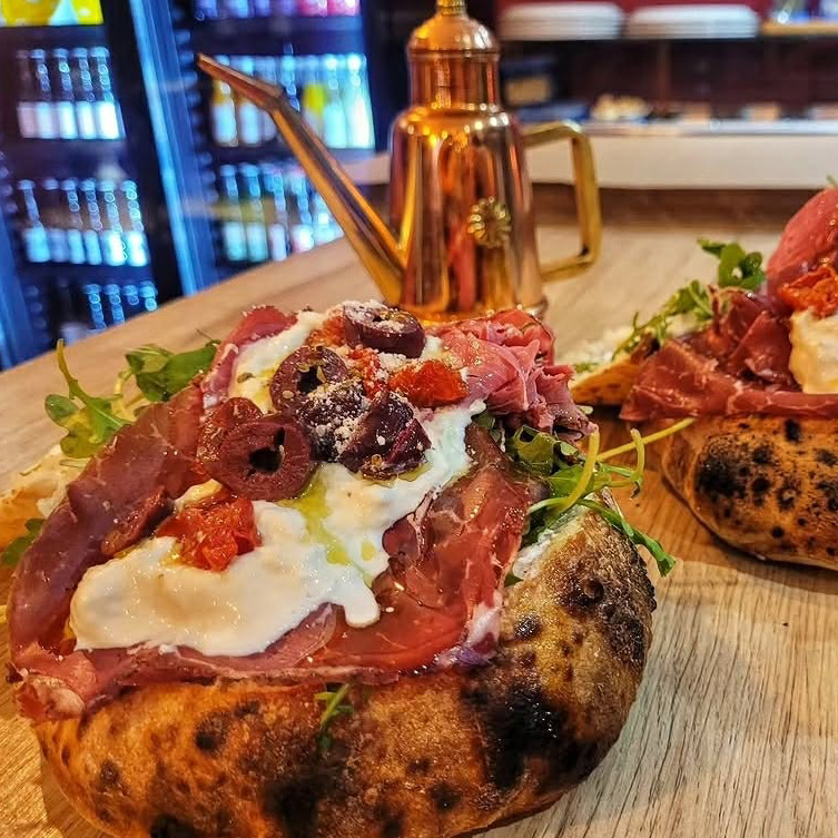 Crème de ricotta, Roquette, Olives dénoyautées, Tomates cerises confites, Bœuf séché, Charcuterie de poulet fermier, Stracciatella, Huile d’olive vierge extra, Parmesan AOP